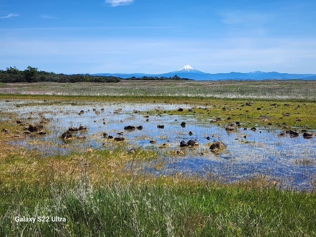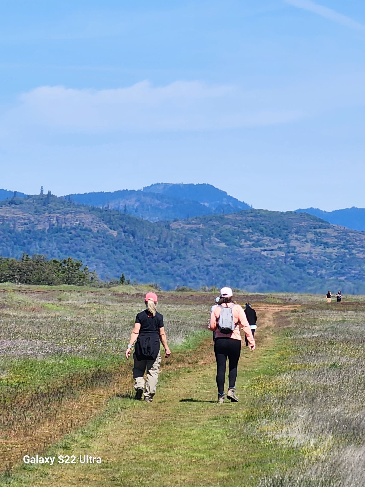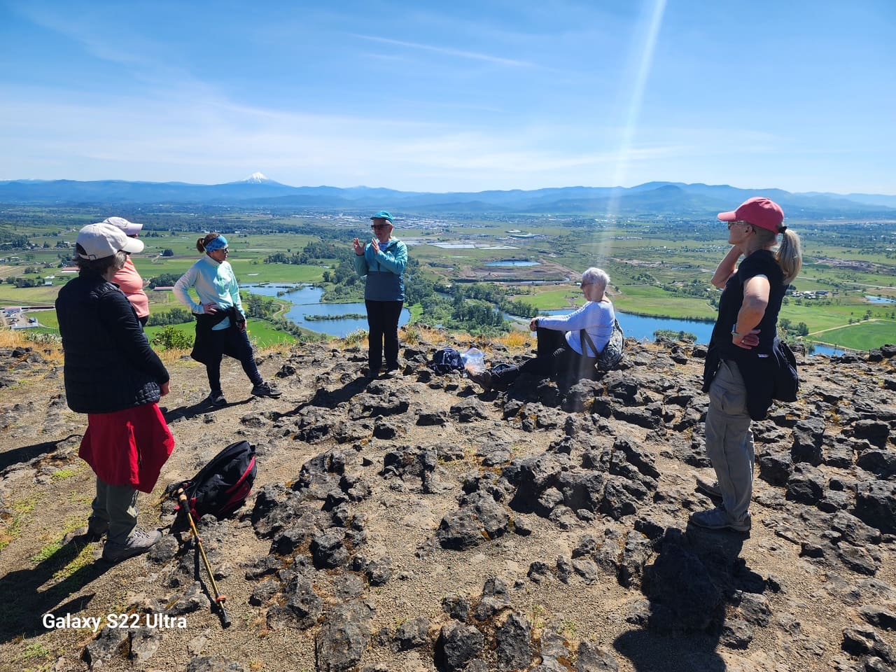 This hike was almost destined not to happen, with the scheduled hike leader unavailable and the scheduled trail covered in fresh snow. Fortunately, a new leader and trail emerged and the chilly morning turned into a beautiful, sunny spring day. Viki Brown led the group of 6 members and one guest (Rebecca) on the Lower Table Rock Trail for a 5.5 mile hike with a few miles of aerobic, uphill climbing. We started the hike by walking the newly-completed 1/2 mile oak savannah trail which is paved and accessible for wheelchairs and walkers. It features benches, shade, nice views and a picnic area where people with mobility challenges can enjoy the outdoors. Once we arrived on the top of the Table Rock , we were treated to massive fields of wildflowers, incredible views and scatterned vernal pools. We enjoyed a relaxing lunch break with views of the orchards and other countryside below. Conversation was varied and comfortable and the time together drifted by easily. Thanks to Lori Miles for the photographs and to Melanie Harris and Theresa Whaley for driving. We'll see you on the trail next month.