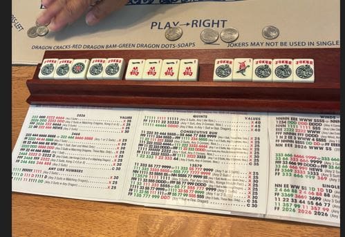 We found out on 4/13/2026. Marcia had a hand we have never seen before. She called Mah Jongg with the new 2026 card, first line under Quints. And she got it by having all 8 Jokers!! Congratulations, Marcia!!!